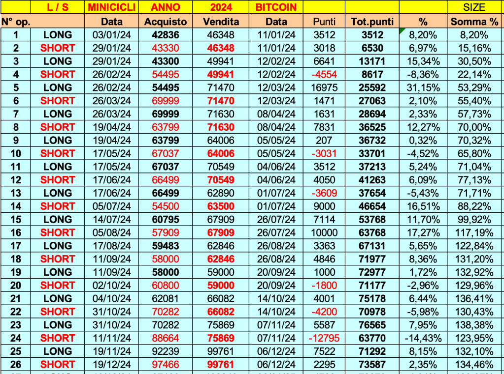 Riepilogo statitistco BITCOIN: 26 ONDE, +73587 punti, +134%, 20 onde positive e 6 negative