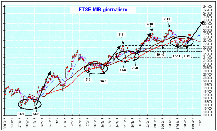 Ben ritrovati. Un altro leggero allungo per il Ftse Mib, arrivato a 22846 punti (+0,37%). Come vediamo nel grafico sotto, un primo obiettivo al rialzo si potrebbe trovare attorno ai 23000-23100 punti; in caso di ritracciamento (anche veloce), avremmo inizialmente i 22400-22500 punti a fungere da possibile supporto. La settimana appena iniziata sarà condizionata dai … Continua a leggere Passaggi Lunari ed Era glaciale (commento di Borsa del 8-1-2018)